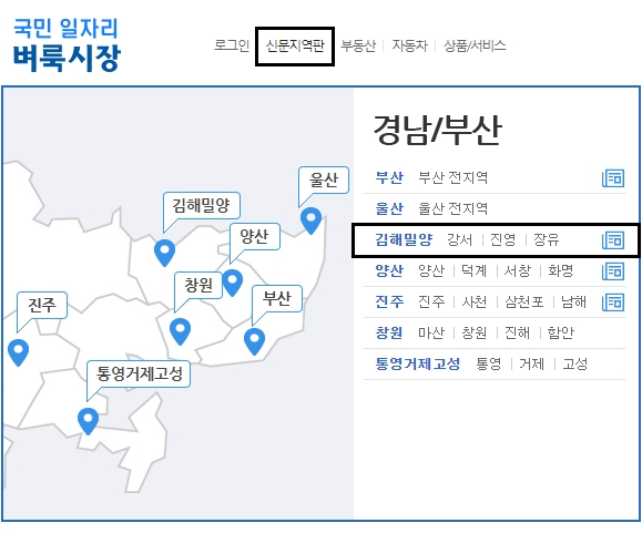 김해, 밀양, 강서, 진영, 장유 지역의 생활정보를 확인할 수 있습니다. 페이지 메인화면 상단에는 구인구직 뿐만아니라 부동산, 자동차, 상품/서비스, 소식함 메뉴도 열람할 수 있으니 필요에 따라 함께 열람해보시기 바랍니다.