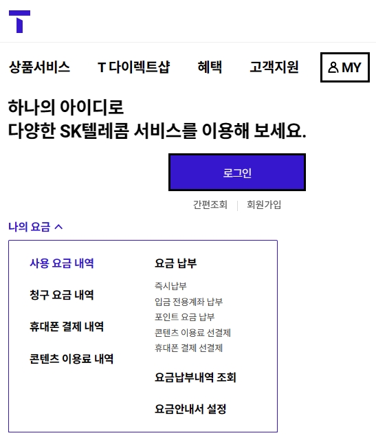 티월드 홈페이지(메인 | T world)에 접속하셔서 로그인 후 [MY] 메뉴로 들어가시면 [나의요금] 카테고리를 선택하여 요금내역이나 요금납부 관련 서비스들을 이용할 수 있습니다.