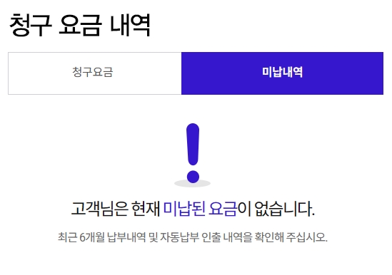 SKT 미납센터 또는 미납내역 확인 페이지는 나의요금> 청구요금내역 > 미납내역 메뉴 순으로 들어가시면 확인할 수 있는데요, 저같은 경우에는 위의 그림처럼 현재 미납된 요금이 없다고 나옵니다.
