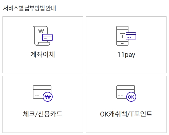 요금납부는 계좌이체, 11pay, 체크/신용카드, OK캐쉬백/T포인트로 하실 수 있습니다.
