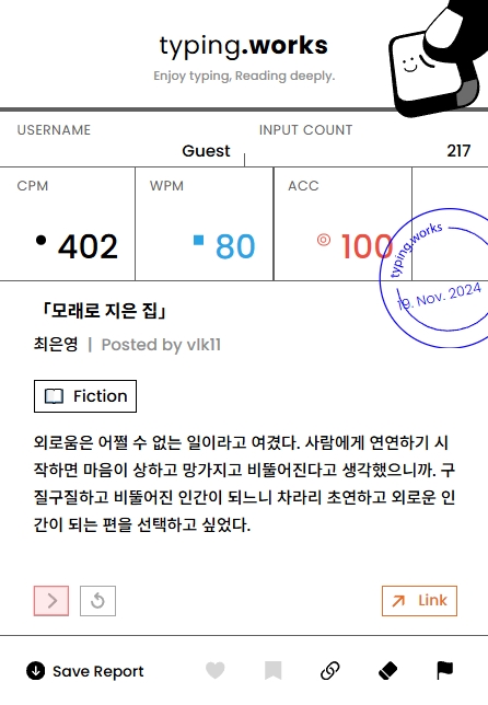 저는 최은영의 모래로 지은 집의 일부를 타이핑 해보았는데요 CPM은 402, WPM은 80, ACC는 100이 나왔습니다. CPM(Characters Per Minute)은 분당 타수, WPM(Words Per Minute)은 분당 단어수, ACC(Accuracy)는 정확도를 의미합니다.