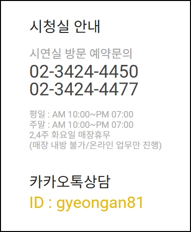 고객센터 또는 시연실 방문예약 문의번호는 02-3424-4450번 또는 02-3424-4477번이고, 연중 무휴로 운영됩니다. 이외에도 팩스(02-3424-4451), 이메일(ansruddks@naver.com), 카카오톡(gyeongan81)을 통한 문의도 가능하니 참고하세요.
