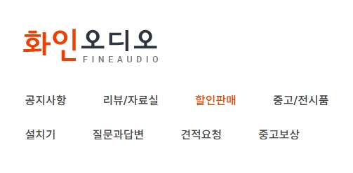 홈페이지(fineaudio(화인오디오))에 접속하시면 위의 그림처럼 공지사항, 리뷰/자료실, 할인판매, 중고/전시품, 설치기, 질문과답변, 견적요청, 중고보상 카테고리를 열람할 수 있습니다.