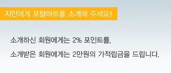 지인에게 포털아트를 소개하시면 소개한 회원에게 2% 포인트를, 소개받은 회원에게 2만원의 가적립금을 드립니다.