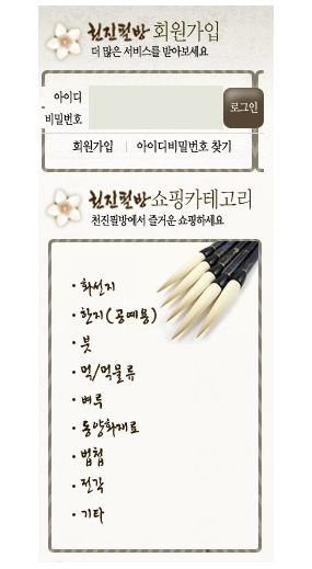 천진필방 홈페이지(:: 천진필방에 오신 것을 환영합니다 ::)에 접속하시면, 메인화면 상단 또는 좌측 영역에서 원하는 카테고리를 선택하고 제품을 구매할 수 있습니다.