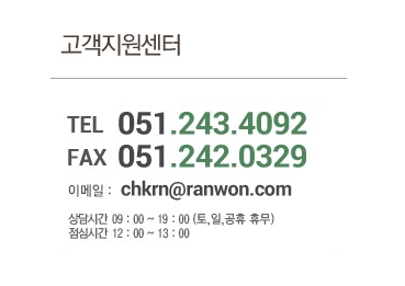 고객센터 전화번호는 051-243-4092번, 팩스번호는 051-242-0329번, 이메일은 chkrn@ranwon.com입니다. 상담가능 시간은 평일 09시부터 19시까지이고, 점심시간은 12시부터 13시까지입니다.