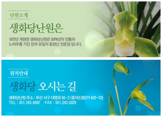 생화당난원은 지난 1972년 3월에 개원하여 1979년~1982년까지 일본춘란 판매 전시회를 5회에 걸쳐 실시했고, 500여회 일본 난계 및 난실을 방문했습니다. 또한 부산난인회, 부경풍란회, 전국만년청회를 창립한 전국 유일의 동양난 전문점입니다.