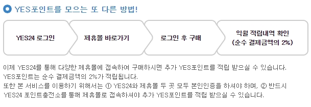 예스24에 로그인하여 제휴몰 바로가기로 접속하여 로그인 후 구매하시면 익월 적립내역을 확인할 수 있으며, 순수 결제금액의 2%를 적립해줍니다. 본 서비스를 이용하기 위해서는 YES24와 제휴몰 두 곳 모두에서 본인인증을 해야하고, 반드시 YES24 포인트 충전소를 통하여 제휴몰로 접속해야 적립이 가능합니다.