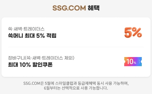SSG.COM 혜택으로는 쓱/새벽/트레이더스에서 쓱머니를 최대 5%까지 적립할 수 있고, 장바구니 최대 10% 할인쿠폰을 제공합니다. SSG.COM은 5월에 스마일클럽과 등급제혜택 동시사용이 가능하며, 6월부터는 선택적으로 사용이 가능합니다.