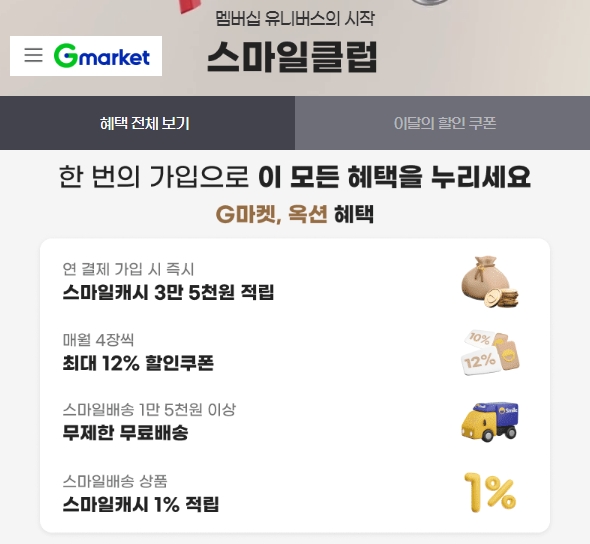 Gmarket 또는 지마켓 스마일 클럽 혜택에 대해서 알아보도록 하겠습니다. 스마일클럽은 한번의 가입으로 지마켓이나 옥션은 물론이고 SSG.COM에서도 혜택을 받는 쇼핑멤버십 서비스입니다. 연회비 3만원으로 매년 연회비 이상의 웰컴기프트와 혜택을 만나보실 수 있어요.