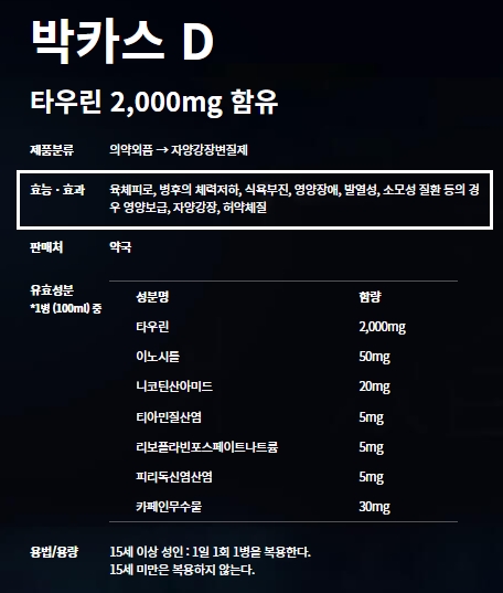 타우린 2,000mg을 함유하고 있으며, 제품분류는 의약외품 및 자양강장변질제입니다. 효능 및 효과는 육체피로, 병후의 체력저하, 식욕부진, 영양장애, 발열성, 소모성 질환 등의 경우 영양보급 및 자양강장과 허약체질에 효과가 있습니다. 판매처는 약국이고, 15세 이상 성인의 경우 1일 1회 1병을 복용하며, 15세 미만은 복용하지 않습니다.