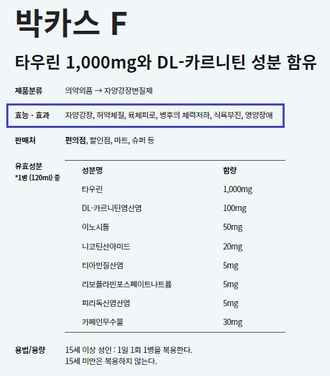 타우린 1,000mg 및 DL-카르니틴 성분을 함유하고 있으며, 제품분류는 의약외품 및 자양강장변질제입니다. 효능/효과는 자양강장, 허약체질, 육체피로, 병후의 체력저하, 식욕부진, 영양장애에 효과가 있습니다. 판매처는 편의점, 할인점, 마트, 슈퍼 등입니다. 용법/용량은 15세 이상의 성인의 경우 1일 1회 1병을 복용하고, 15세 미만은 복용하지 않습니다.