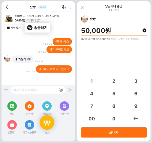 거래할 시간과 장소를 정해야 하며, 보통은 판매자와 가까운 곳으로 정하는 경우가 많습니다. 직접 만나서 물건의 상태를 확인한 후 거래가 성사되면 미리 준비한 현금을 전달하거나 계좌이체 하시면 되겠습니다. 당근페이를 이용하면 상대방에게 보다 편리하게 송금할 수 있으며, 당근페이 이용방법은 좀이따가 자세히 말씀드릴게요.