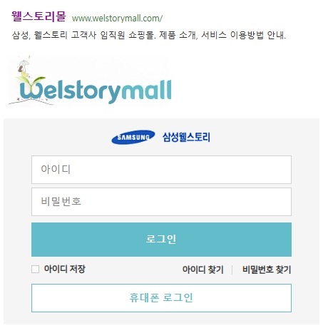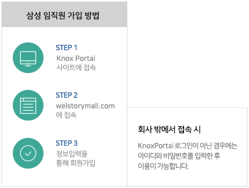 위의 그림과 같이 로그인 화면이 나오는데요, 아이디와 비밀번호를 입력하여 접속이 가능합니다. 삼성 임직원 가입절차는 Knox Portal 사이트에 접속 > welstorymall.com에 접속 > 정보입력을 통한 회원가입 순입니다.