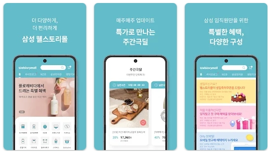 해당 앱은 삼성 임직원을 위한 쇼핑몰 웰스토리몰의 모바일용 버전이고, 삼성 임직원의 복지를 위하여 제공되는 전용쇼핑몰이며, 합리적이고 알뜰한 쇼핑서비스를 제공합니다. 해당 서비스는 삼성 임직원 계정을 통해서만 PC에서 가입이 가능하고, 이외에는 사용이 불가합니다.