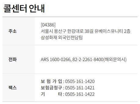마지막으로는 외국인근로자보험 콜센터 안내를 보겠습니다. 주소는 서울시 용산구 한강대로 38길 유베이스유니티 2층 삼성화재 외국인전담팀입니다. 전화는 1600-0266번, 해외문의시 82-2-2261-8400번입니다. 팩스번호는 보험가입 0505-161-1420번, 보험금청구 0505-161-1421번, 기타 0505-161-1422번입니다.