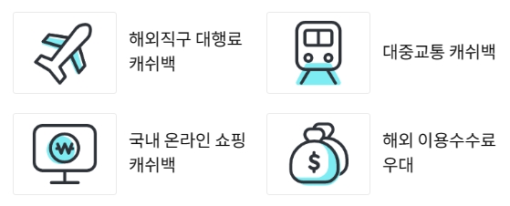 국내온라인 쇼핑업종에서 2만원당 200원 캐시백 혜택이 있으며, 월 최대 5천원까지입니다. 해외 이용수수료 우대혜택도 있는데요, 물품구매 이용금액의 1.0% 및 현금인출 이용금액의 1.0%(현지 ATM 이용수수료 별도)를 우대해드립니다.