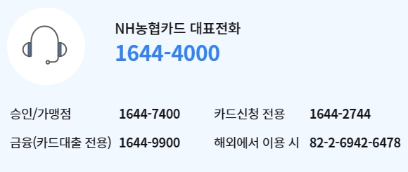 기타 궁금하거나 문의하고자 하는 사항이 있으시면 NH농협카드 대표전화 1644-4000번을 이용해주세요. 승인/가맹점, 카드신청 전용, 금융(카드대출 전용), 해외에서 이용시 전화번호도 안내되어 있으니 위의 그림을 참고하시기 바랍니다.