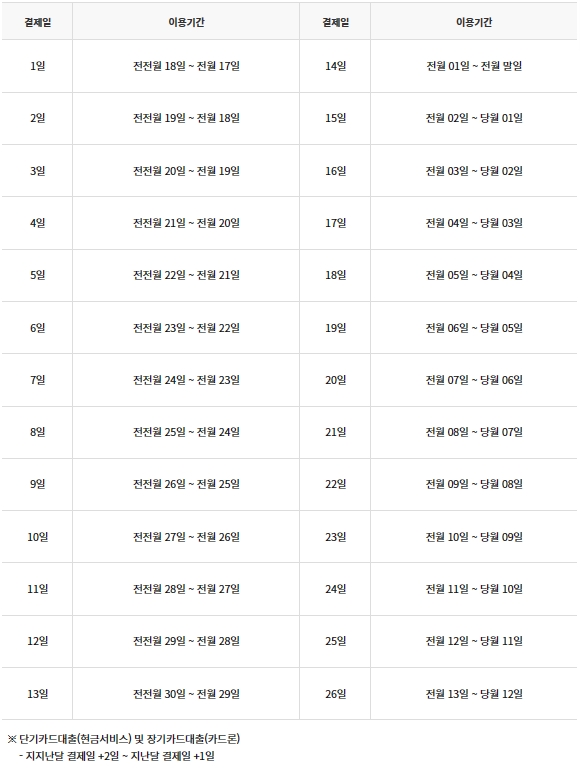 농협카드 홈페이지에 접속하여 고객센터 > 카드 이용안내 > 결제일별 이용기간 메뉴 순으로 들어가시면 확인할 수 있고, 아래 표를 참고하시면 됩니다. 현금서비스 및 카드론은 지지난달 결제일 +2일 ~ 지난달 결제일 +1일입니다.