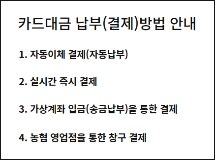 NH농협카드 대금은 자동이체 결제, 실시간 즉시결제, 가상계좌 입금, 농협 영업점 창구를 통하여 납부 및 결제할 수 있습니다.