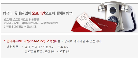 인터파크 티켓 고객센터 1544-1555번으로 연락하시면 전화예매를 할 수 있는데요, 운영시간은 평일/토요일 09시부터 18시까지 및 일요일/공휴일 09시부터 18시까지입니다.