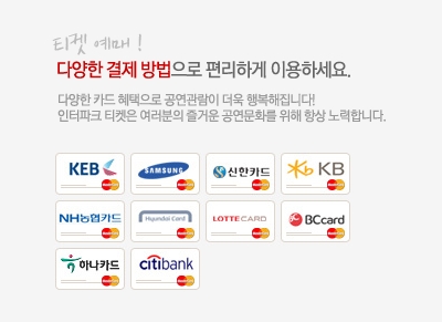 결제는 신용카드, 온라인입금, 휴대폰결제, 실시간 계좌이체, 예매권, 컬쳐캐쉬, 해피머니, 인터파크 페이와 같이 다양한 수단을 제공하며 홈페이지에 접속하시면 각각의 결제방법에 대한 상세안내를 확인할 수 있습니다.