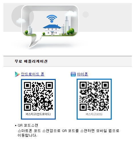 애플의 앱스토어 또는 구글의 플레이스토어에서 검색하거나, 아래의 QR코드 스캔으로 어플리케이션을 다운받을 수 있습니다. 모바일 웹사이트는 스마트폰이나 태블릿 브라우저에서 직접 접속(메인화면 | 이동의즐거움 (bustago.or.kr))하거나, 모바일 포털사이트에서 버스타고를 검색하여 접속할 수 있어요.